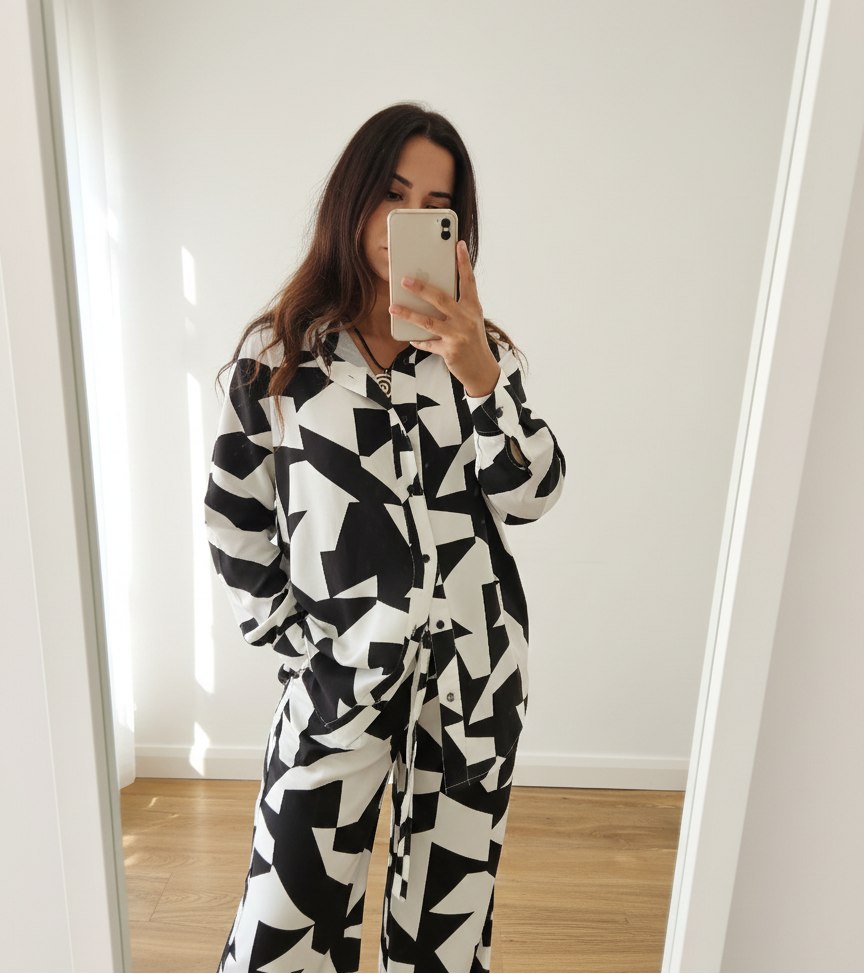 Oversized shirts have to be a must for us all! We are truly obsessed with our mono printed shirt designed with AW in mind with its durable twill fabric, perfect for cooler days. With trousers to match, it couldn’t get any better.